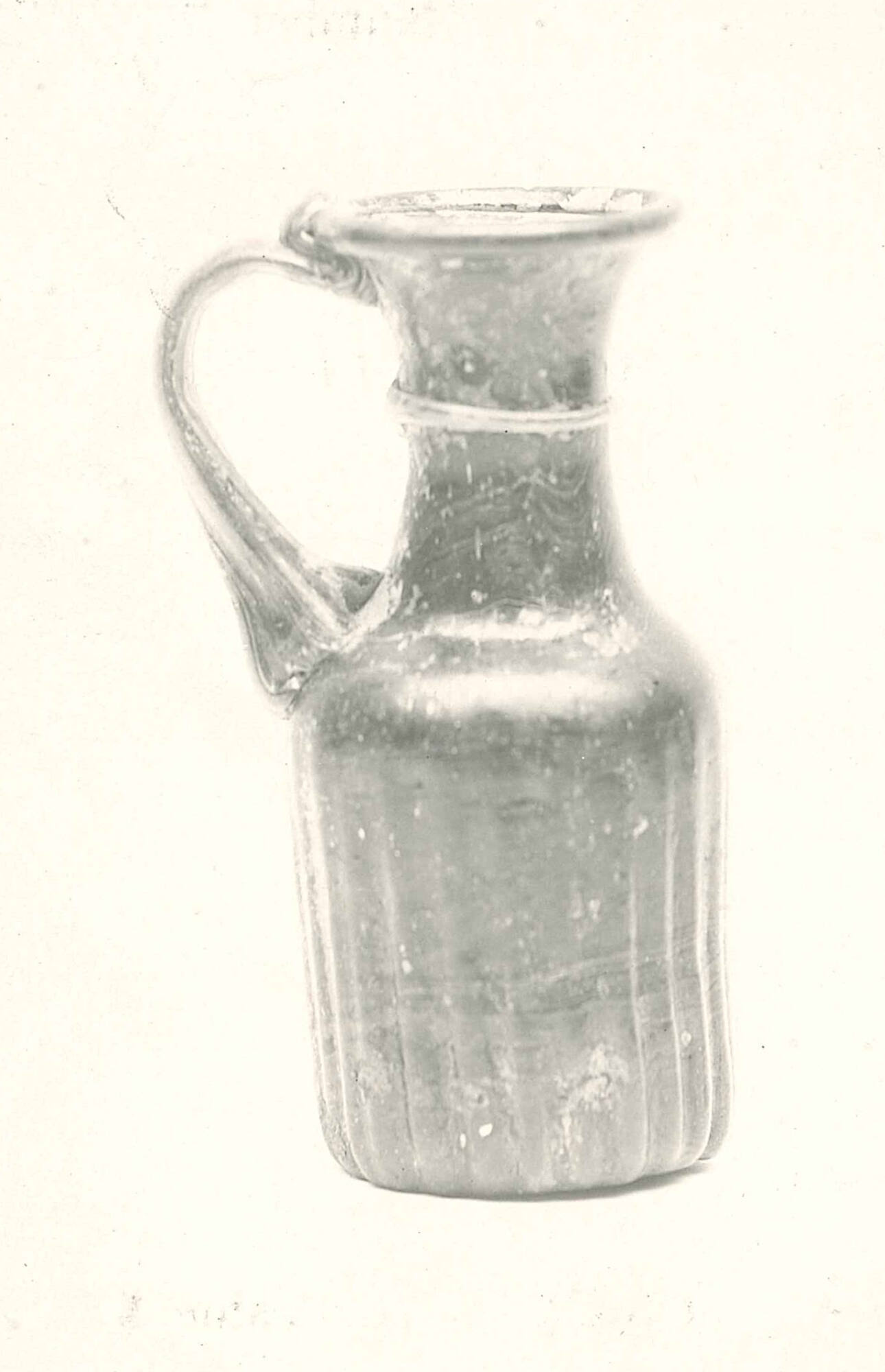 DescriptionThis glass jug from the sixth century CE is made from dark opaque glass with streaks of reddish brown. The body was shaped in a patterned mold and the neck and rim were shaped by hand. A single handle, made from translucent blue-green glass, was attached from the shoulder to the rim. The neck is decorated with a coiled thread, and the body has 25 vertical ridges from shoulder to base.