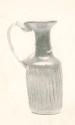 DescriptionThis jug was made of olive-colored glass shaped in a mold and finished by hand. It has a cylindrical body with vertical ridges, a single handle, and a small stone trapped in the shoulder during production. A thread of glass wraps once around the neck, and the handle was added on top of it. The rim and mouth were shaped using tools after blowing.