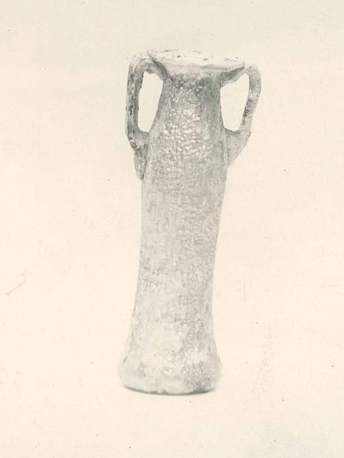 DescriptionThis vessel, classified as Tubular Jar IA1d, is made of thin glass with a transparent natural green tint and translucent pale green handles. The exact color and fabric cannot be fully determined due to weathering. The tubular body has a slight bulge at the shoulder and broadens toward a flat base with a central depression. Two angular coil handles are attached to the shoulder and folded downward/inward and upward/outward just below the rim. A pontil mark cannot be detected due to weathering.