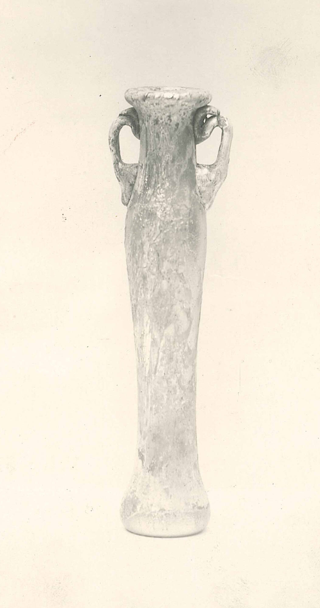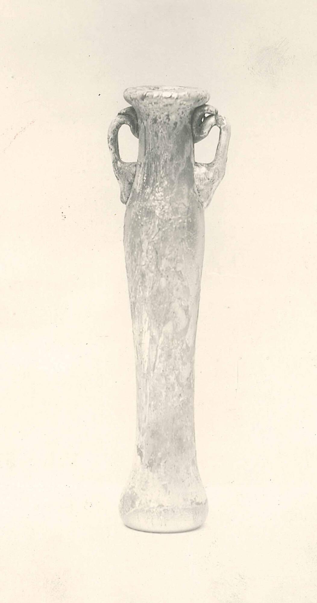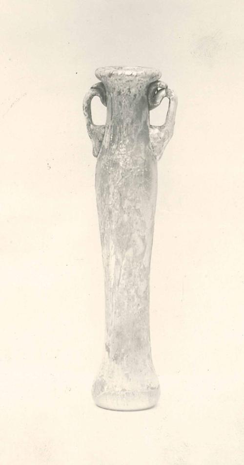 DescriptionThis vessel, classified as Tubular Jar IA1d, is made of thin glass with a transparent natural pale green tint; the exact color and fabric cannot be fully determined due to weathering. Blowing spirals are visible. The jar was free-blown with the pontil mark ground down. It features a hollow rim folded outward, upward, inward, and flattened; a tubular neck; a strongly sloped shoulder; and a slender tubular body that is widest just below the shoulder and broadens again at the base. The base is flat with a central depression. Two curved coil handles, in a similar pale green, were applied to the shoulder and attached to the neck below the rim, where they are folded downward, upward, and outward to form an open loop. Excess glass at the tips of the handles was snapped off.