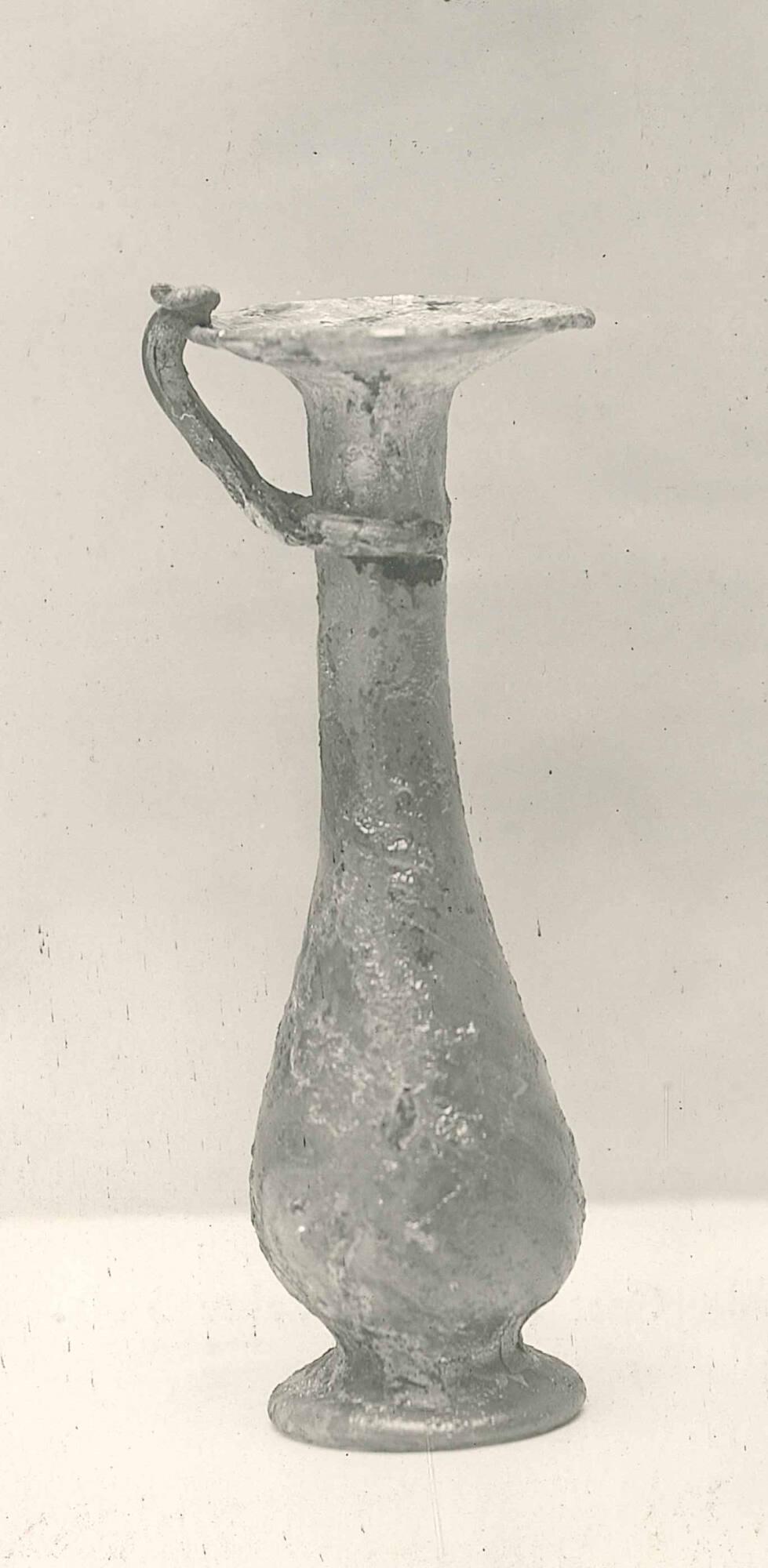 DescriptionThis jar was made by blowing glass into a mold, twisting the form, and adding details by hand. A ribbed pattern spirals around the body, and two small handles curve from the rim to the neck. The base is pushed in to form a ring, and a decorative thread circles the neck.