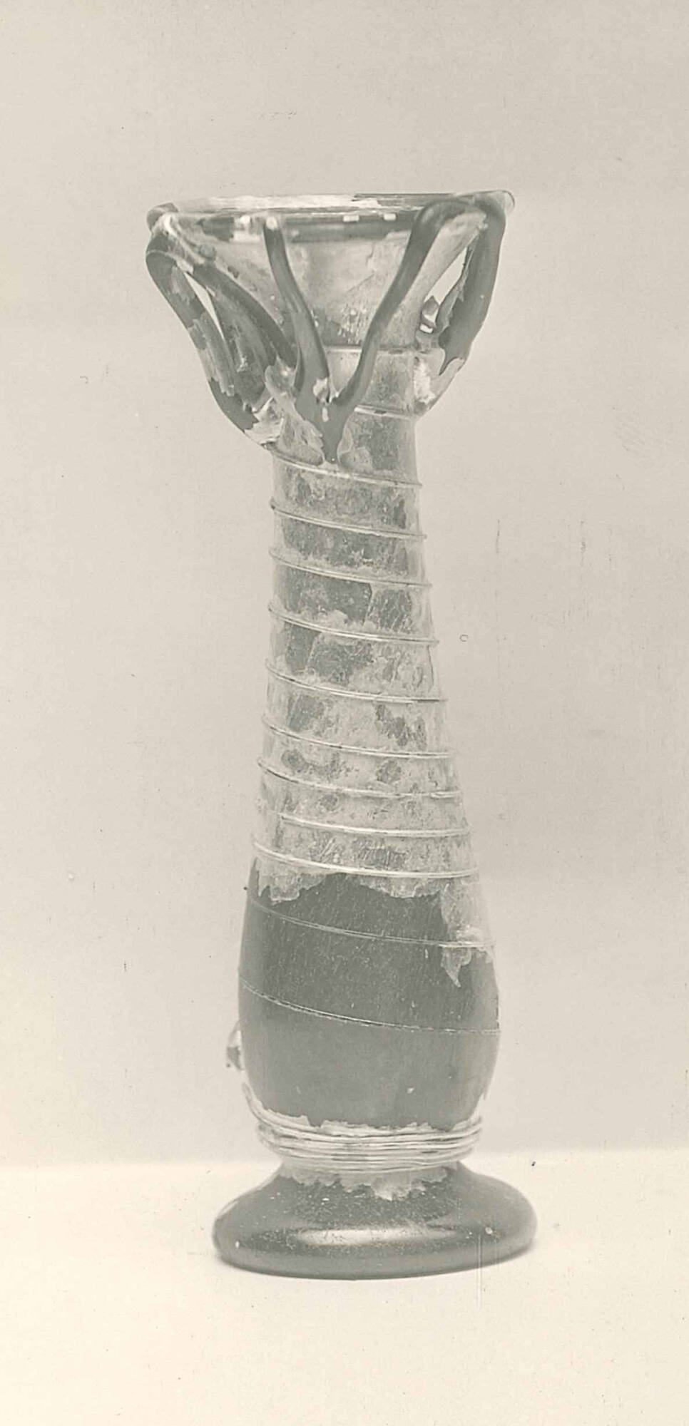 This slender jar was made from olive-brown glass using free-blown techniques. Its decorative highlights include a zigzag pattern on the upper body and a coiled thread wrapped around the surface. The jar has a flaring rim, a tubular body that bulges slightly, and a hollow base ring. These stylistic features, along with the decorative threads, were added while the glass was still hot.