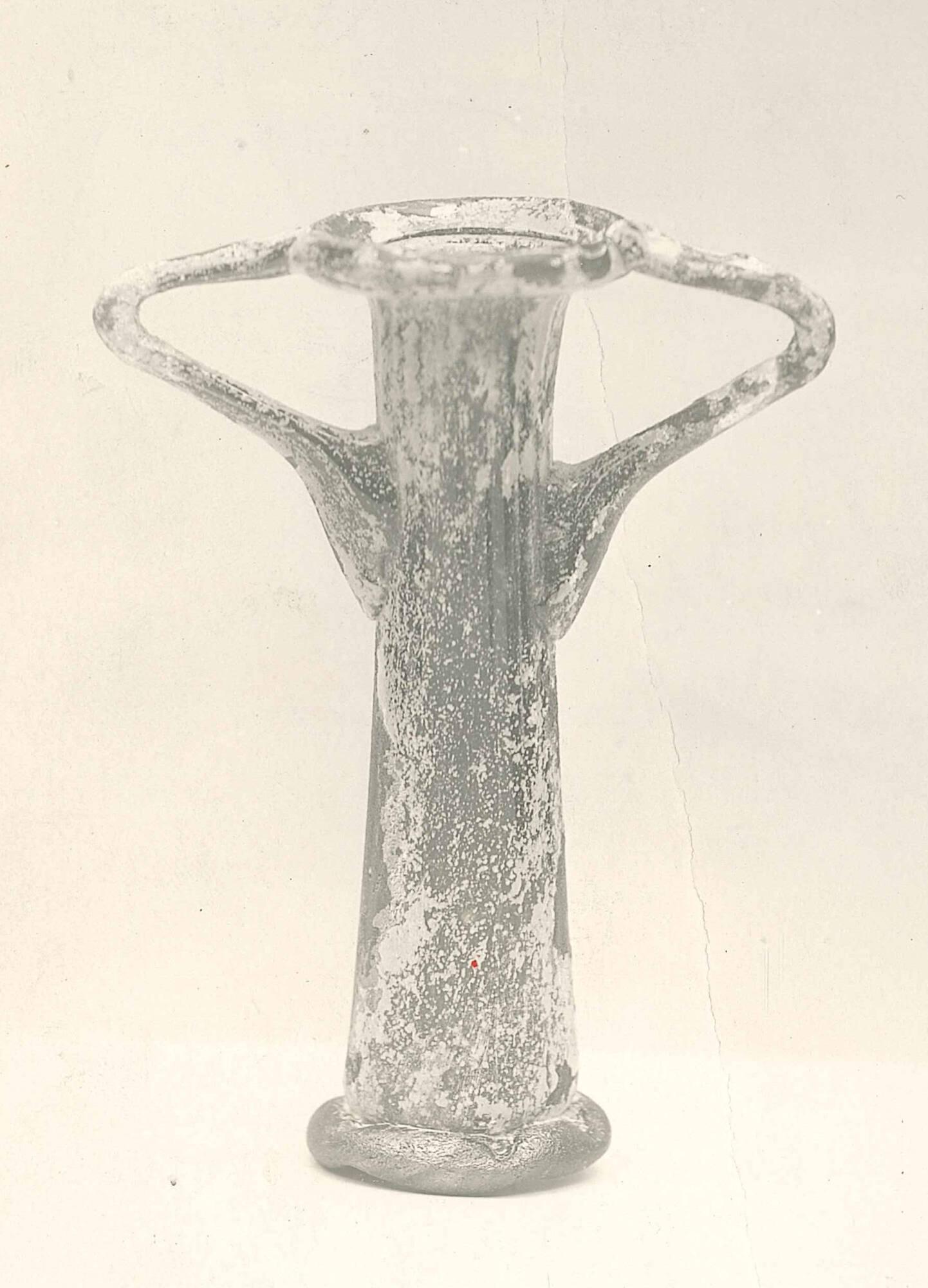 DescriptionThis small glass jar has straight sides, two handles, and a slightly bulging lower body. Decorative ribs run from top to bottom, and the base shows pinched marks around the edge.