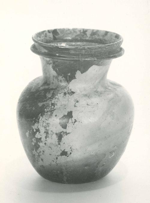 DescriptionThis 4th-century jar features a wide, rounded body that curves inward toward a narrow neck. The rim has a small roll beneath it. The streaked reddish glass shows signs of the blowing process, including small bubbles and spiral patterns.