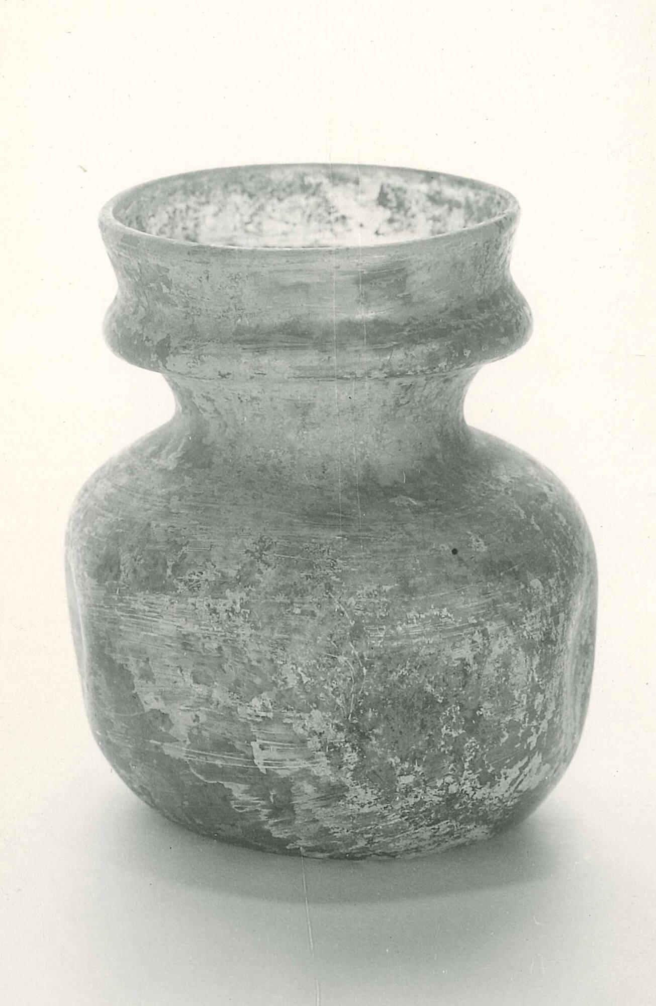 DescriptionThis 4th- to 5th-century glass jar has a rounded rim with a wide roll beneath, a straight neck, and a gently sloping shoulder. The squat body is widest at its center and features shallow circular indentations. The jar was shaped by hand using a blowing technique, leaving visible spirals and a pontil mark on the base.