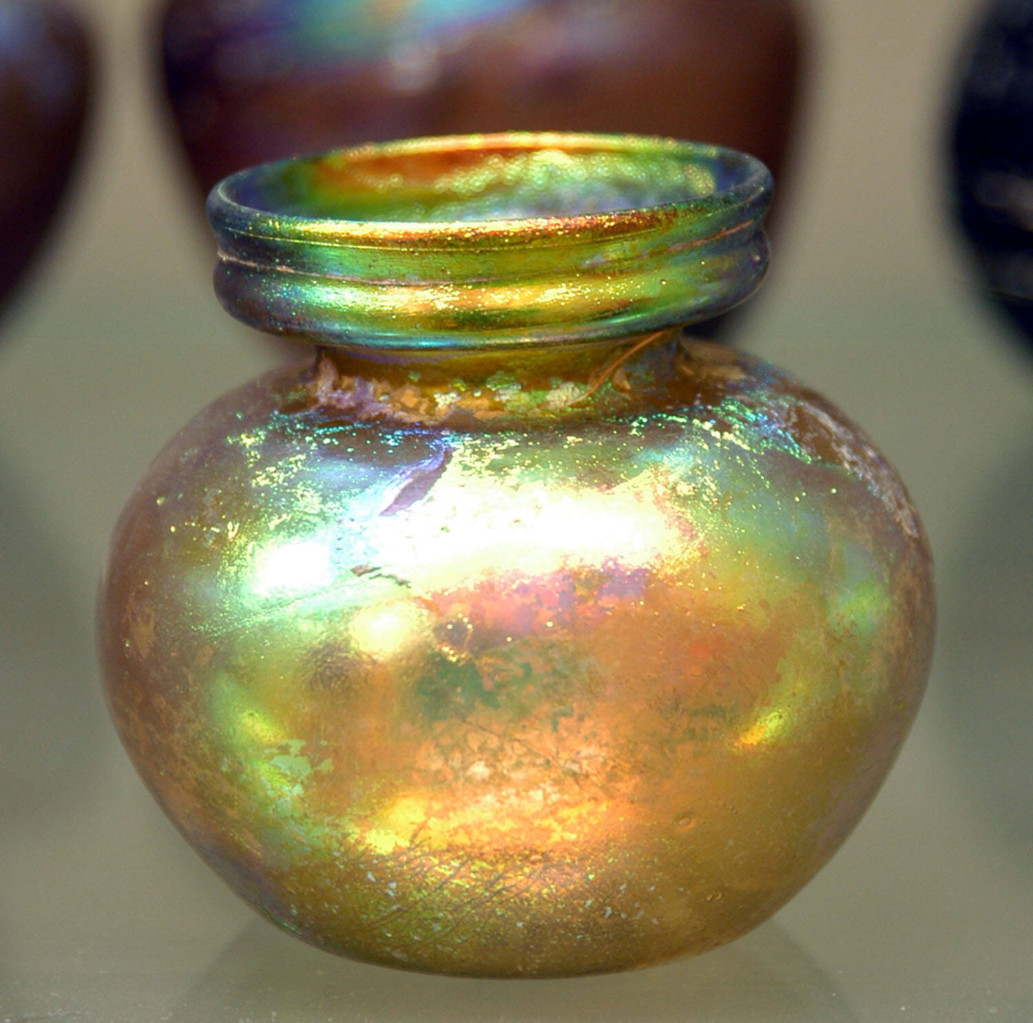 DescriptionThis small, round-bodied jar dates to the fourth century CE. It was made by blowing molten glass and shaping it with tools. The neck is short and curves inward deeply before flaring out into a wide collar-like rim. The body is spherical, and the base is gently concave. The jar's original color is now obscured due to weathering over time.