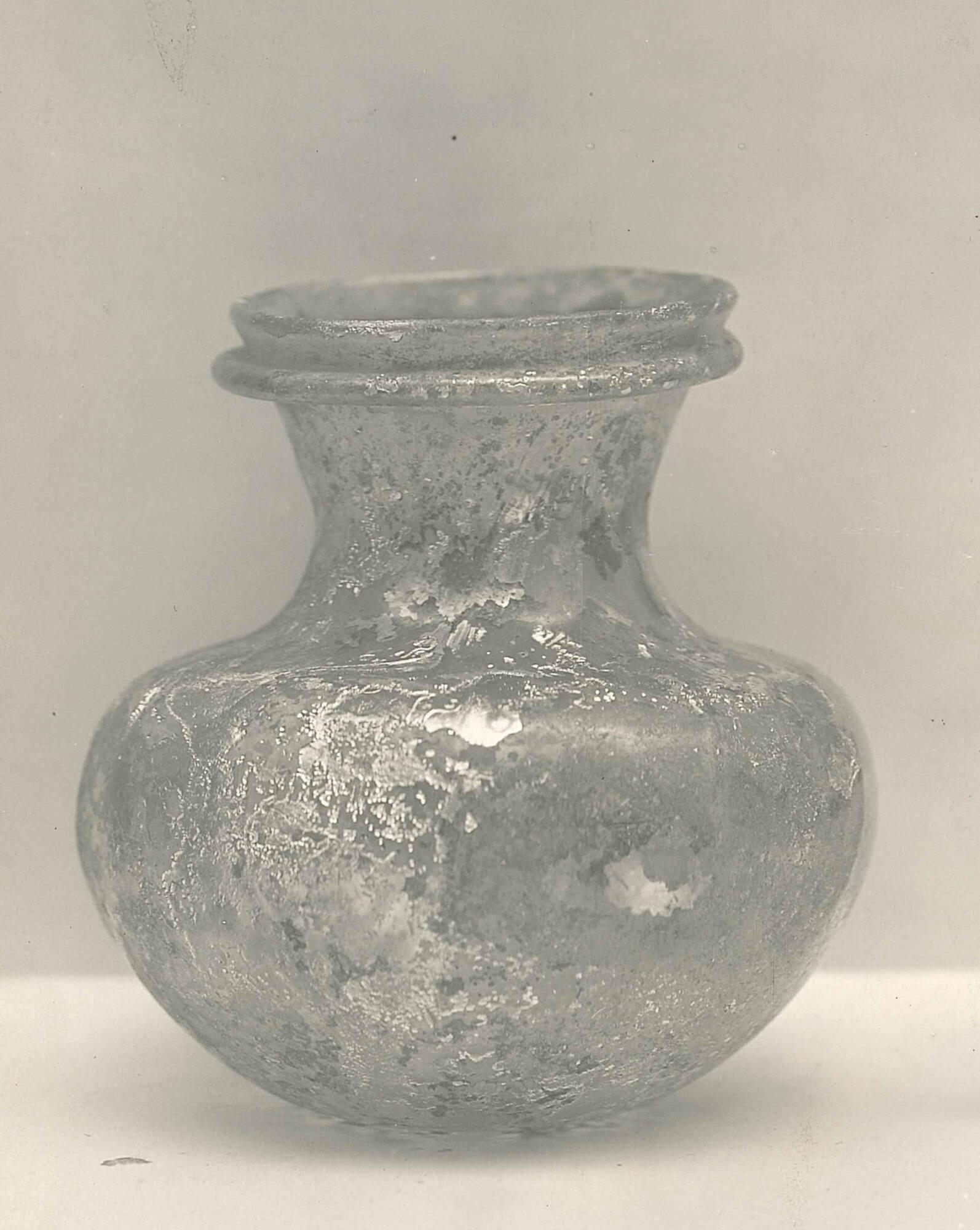 The rim is rounded and thickened in the flame, with a narrow projecting roll below it. The neck is tall and concave, curving smoothly into a horizontal shoulder. The squat bulbous body has its greatest diameter above the midpoint. The flat base includes a small depression at its center.