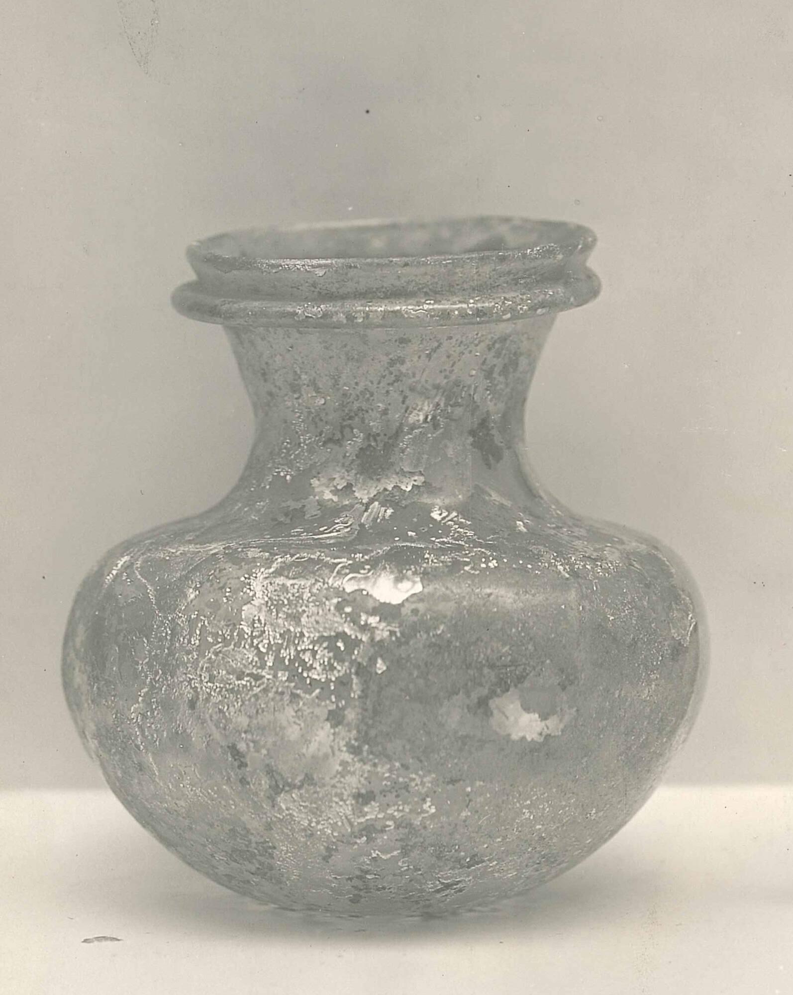 Descriptionbubbles. The glass is transparent with a natural grayish yellow-green tint (near 5 GY 7/2), though the exact color cannot be determined because of weathering. The vessel is free-blown and tooled, with no pontil mark present.