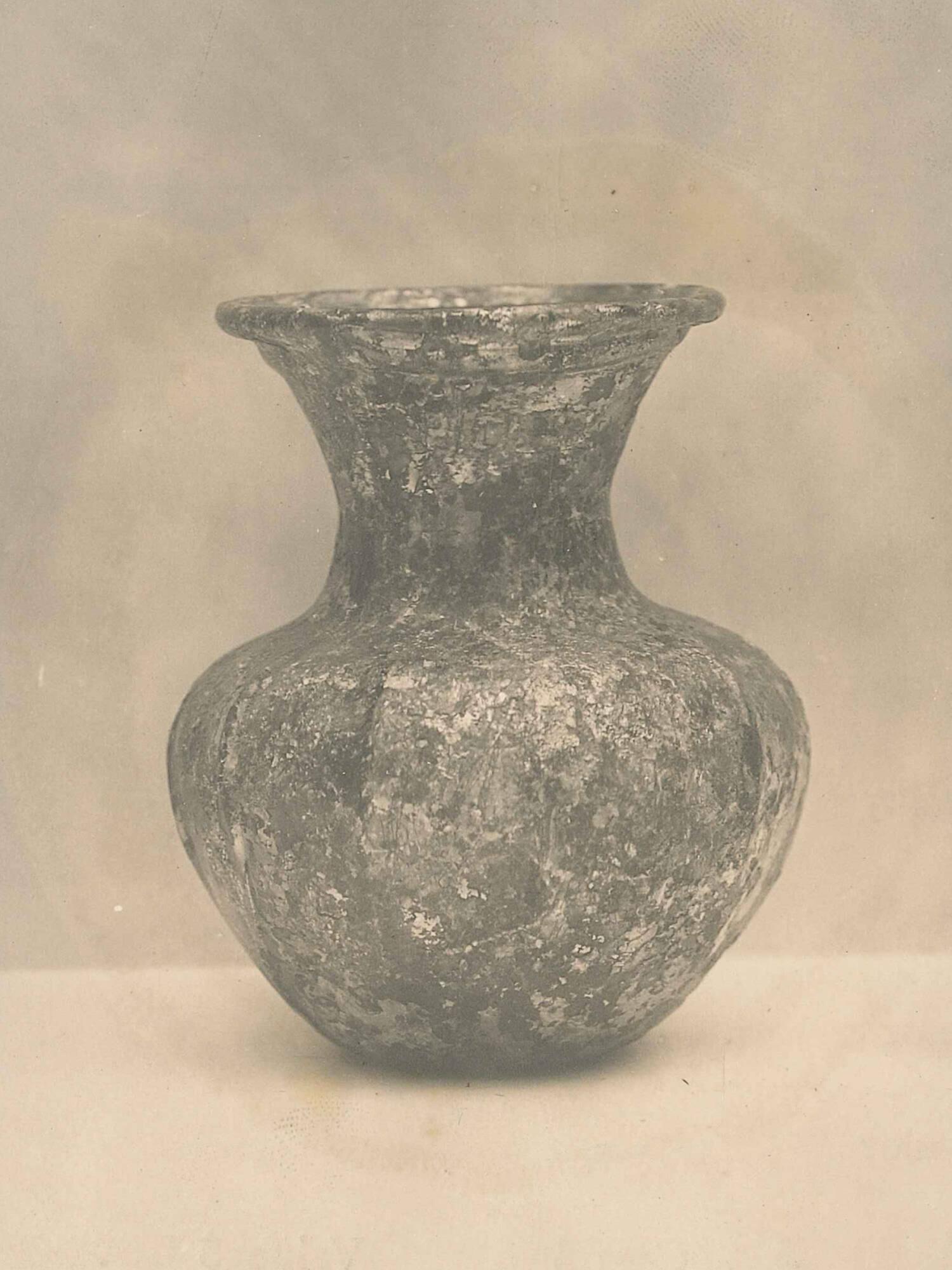 DescriptionThis bulbous jar (Class AJ33) is made of transparent, manganese-colored glass with a streaky grayish red-purple hue (near 5 RP 4/2). The glass is free-blown and tooled, and a pontil mark is present but too fragmentary to measure.