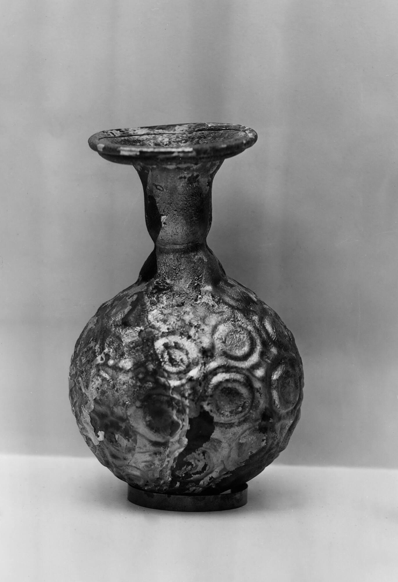 DescriptionThis thin, translucent spherical bottle was mold-blown in a two-part mold and then tooled. The glass is a light manganese purple with rich iridescence. The body is decorated overall with a pattern of circles and polygons. The vessel has a globular body with a funnel-shaped neck.