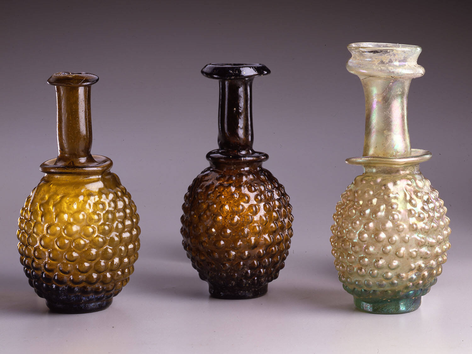 DescriptionThis translucent light olive-brown bottle (near 5 Y 5/6) was mold-blown in a three-part mold for the body and shoulder collar and free blown for the neck and projecting roll. The bottle has a triangular hollow rim folded downward, outward, upward, and inward. The tall cylindrical neck constricts at its base where it meets a hollow projecting roll above the shoulder collar. The ovoid body rests on a slightly concave base. The surface is decorated with a crisp relief pattern of ten interlocking rows of twenty-one contiguous hemispherical knobs that resemble stylized grapes. Small triangular leaves with a central vein are positioned at the shoulder opposite each other, centered between the mold seams. On the underside of the base, three narrow raised concentric circles can be seen. This vessel belongs to the Stylized Grape Bottle, Series A classification.