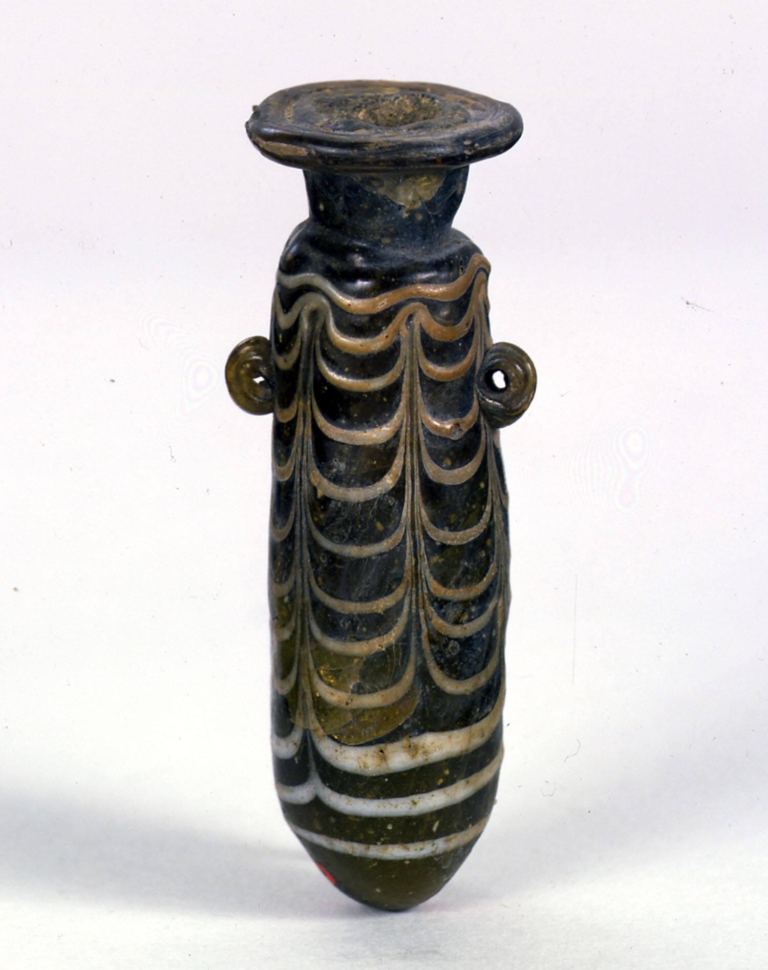 DescriptionThis miniature alabastron features a golden-brown ground with opaque white decoration. The vessel has a moderately broad horizontal rim-disk, a cylindrical neck that tapers downward, and a distinct, short right-angled shoulder with a constriction at the neck. Its cylindrical body tapers slightly upward to a convex, almost pointed bottom. Two vertical golden-brown ring handles are attached below the shoulder. An unmarvered opaque white thread is applied at the rim, while a second, partly marvered opaque white thread begins on the shoulder, wound in a wavy horizontal line. This thread is then tooled into a festoon pattern that extends to the lower body, where it is again wound in horizontal lines to the basal angle. The bottle is core-formed, with applied handles, rim-disk, and both unmarvered and partly marvered threads.