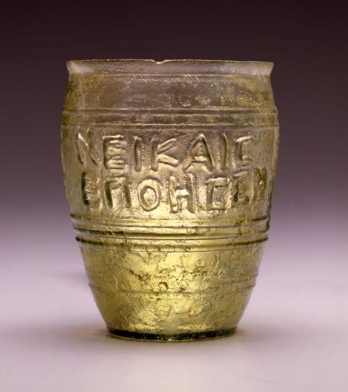 Label TextThis delicate green cup is a rare example of ancient branding. It was blown into a mold carved with the maker's name, "Neikais," and a slogan: "Let the buyer remember." While many ancient artisans remained anonymous, glassmakers in the Syro-Palestinian region during the 1st century often signed their work to guarantee quality.