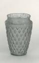 DescriptionThis mold-blown glass beaker was made during the first century CE. It has a distinct angled shoulder and a cone-shaped body. The decoration includes a line of small triangles and rows of diamond-shaped patterns. The base is flat with four small raised circles.