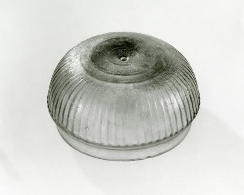 DescriptionHemispherical bowl of transparent, possibly pale green glass, with medium thin walls and pinprick to small spherical bubbles. The rim was free blown and lightly ground, with a concave lip below. The body was mold-blown with sixty-four vertical flutes that extend from a faint ridge beneath the shoulder to just above the base. The bowl has a pronounced shoulder, convex sides, and a flat base with a central depression. On the underside of the base, three raised concentric circles surround a central boss.