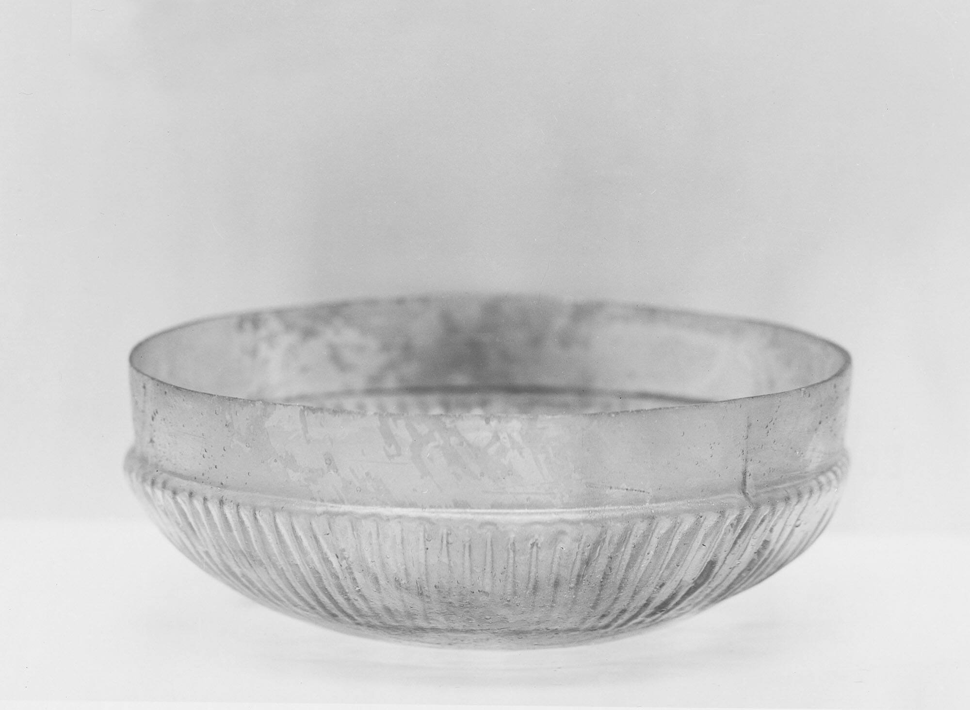 DescriptionShallow bowl of transparent, possibly colorless glass, blown into a multipart vertically grooved mold. The mold likely consisted of two vertical sections that produced the ribbed area. Mold seams are visible only on the rim. The bowl has a straight, lightly ground rim, convex sides, and a slightly concave base. Ninety-five short vertical ribs, each approximately 2.5 cm long, encircle the body. On the underside, three concentric circles bordered by grooves surround a central boss. The glass is thin, with pinprick and small spherical bubbles.