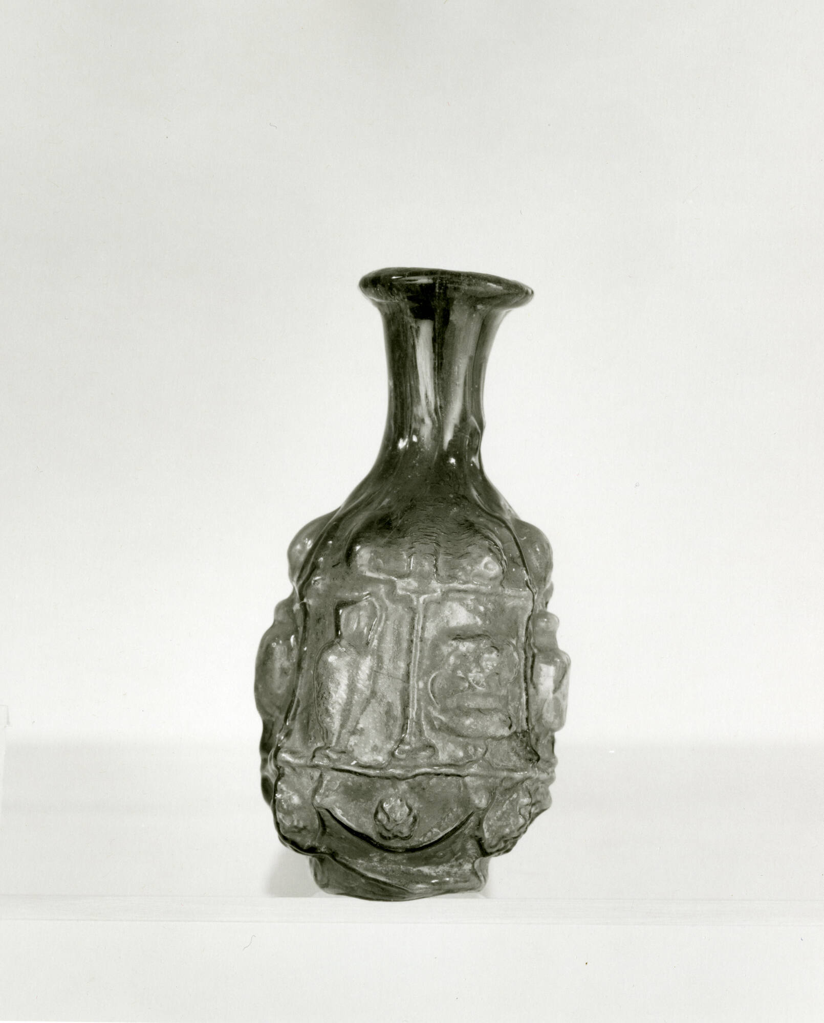 DescriptionThis small hexagonal bottle was shaped in a four-part mold and features panels with tiny relief images of jugs and bowls. Columns separate each panel, and fruit decorations encircle the bottom. The rim and neck were shaped by hand tools, and slight crimp marks show where the bottle was held during finishing. The base is flat with two raised rings, a detail copied from metal containers. Some areas of decoration are blurred, possibly from the glass shifting in the mold while being formed.