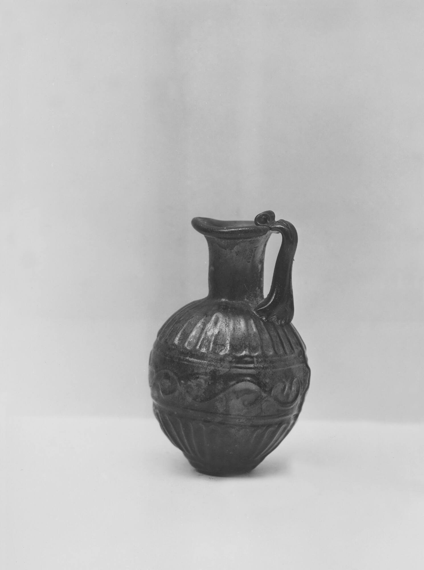 The cylindrical neck was free blown and tapers slightly downward. The ovoid body was mold blown using a two-part mold composed of two vertical sections (MCT VIII). A single continuous mold seam runs across the base, which is uneven due to misaligned mold edges. The flat base lies in two planes. A coil handle, drawn thin and folded back, is attached from the shoulder to the top of the rim with a projecting loop above and is positioned near the mold seam.