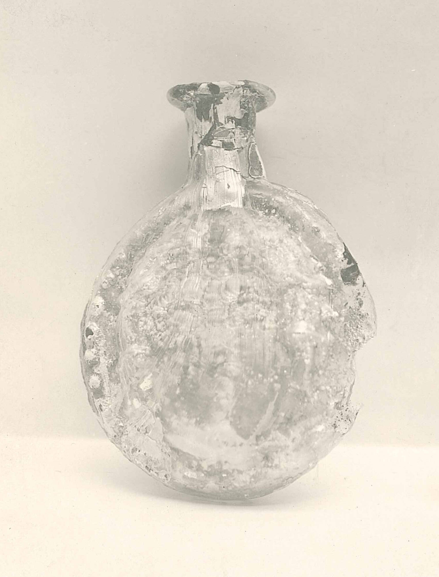 DescriptionThis translucent pale green (5 G 7/2) bottle was mold-blown into a two-part vertical mold (MCT VIII F), leaving a continuous seam around the body’s circumference. Its medium-thin fabric is obscured by weathering. The vessel has a flat-sided circular body with a tubular neck and a convex base, which prevents it from standing upright. Each side displays a raised Medusa face with bulging brows and eyes, a long narrow nose, and small parted lips. The hair is parted at the forehead and drawn back by narrow horizontal bands resembling snakes. The face is surrounded by a ring of raised knobs.
