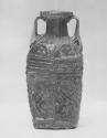 DescriptionThis blue glass bottle has a hexagonal shape and two thin handles. It was made using a two-part mold, with added details like raised scrolls and palm fronds in panels along its sides.