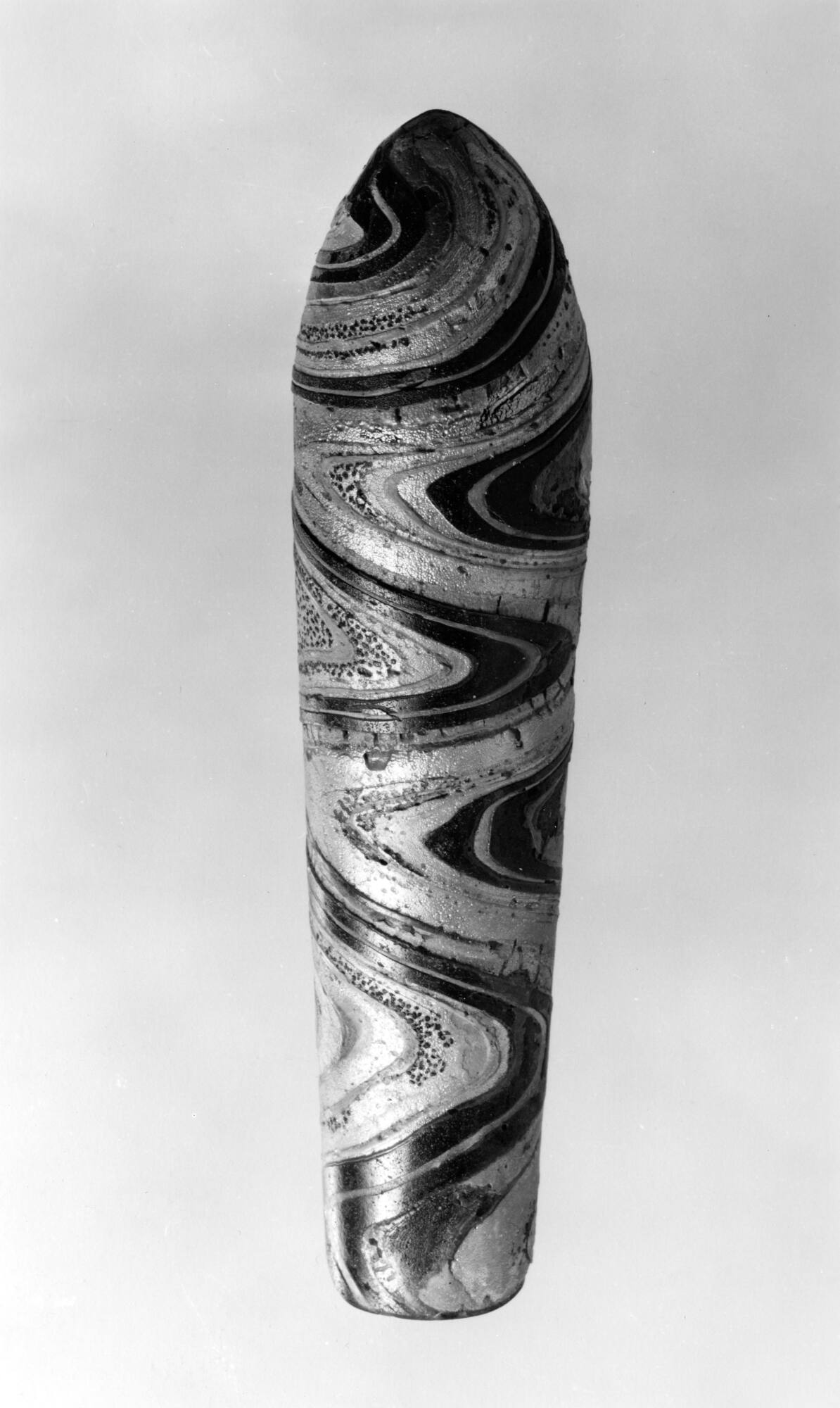 DescriptionA tall, slender vessel with a flat-edged upright rim and straight sides that taper upward from a convex, pointed bottom. The body features a multicolored, wavy "gold-band" mosaic pattern created from four distinct vertical glass canes. The repeating cane sequence consists of: opaque medium blue; dark blue with a central opaque white line and streaks; golden-yellow; and colorless glass encasing shattered gold leaf. The exterior surface is rotary-polished, while the interior shows patches of weathering.