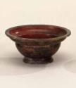 DescriptionThis is a small carinated bowl made of opaque red glass. It was cast and rotary-polished on both surfaces, with cutting on the interior. The base ring was cast as part of the vessel. The bowl has an almost horizontal rim with a flat edge, a carinated side with two convex curves, a concave upperside of the floor, and a very slightly convex underside. The base ring is outsplayed with a flat edge. On the interior, a narrow horizontal groove is cut just below the rim.