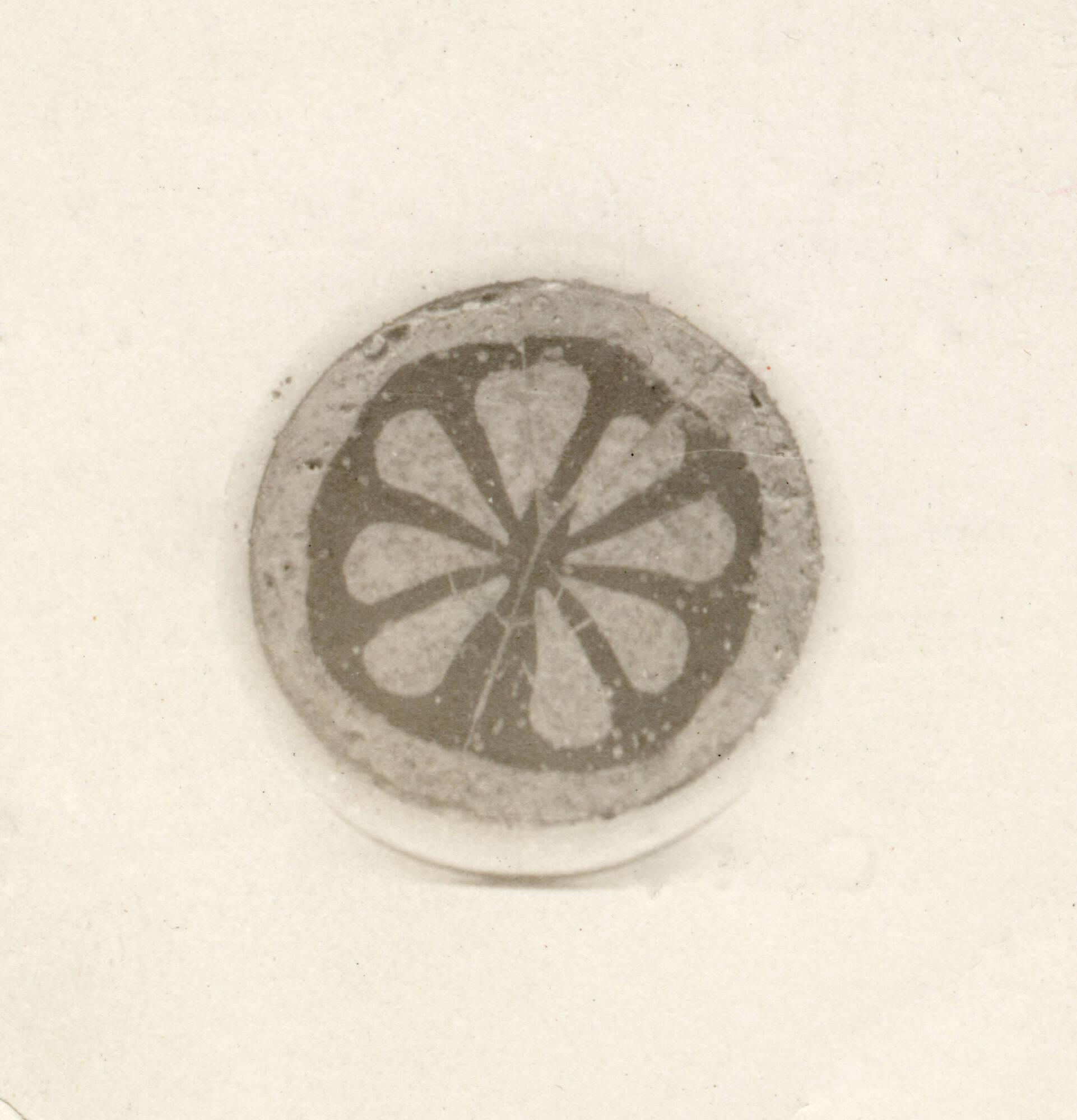 DescriptionThis circular glass piece was made by combining two sections of patterned mosaic canes. Each cane shows a central yellow rosette surrounded by colored rings in red, yellow, and blue. The surfaces are flat, and the edges are straight.