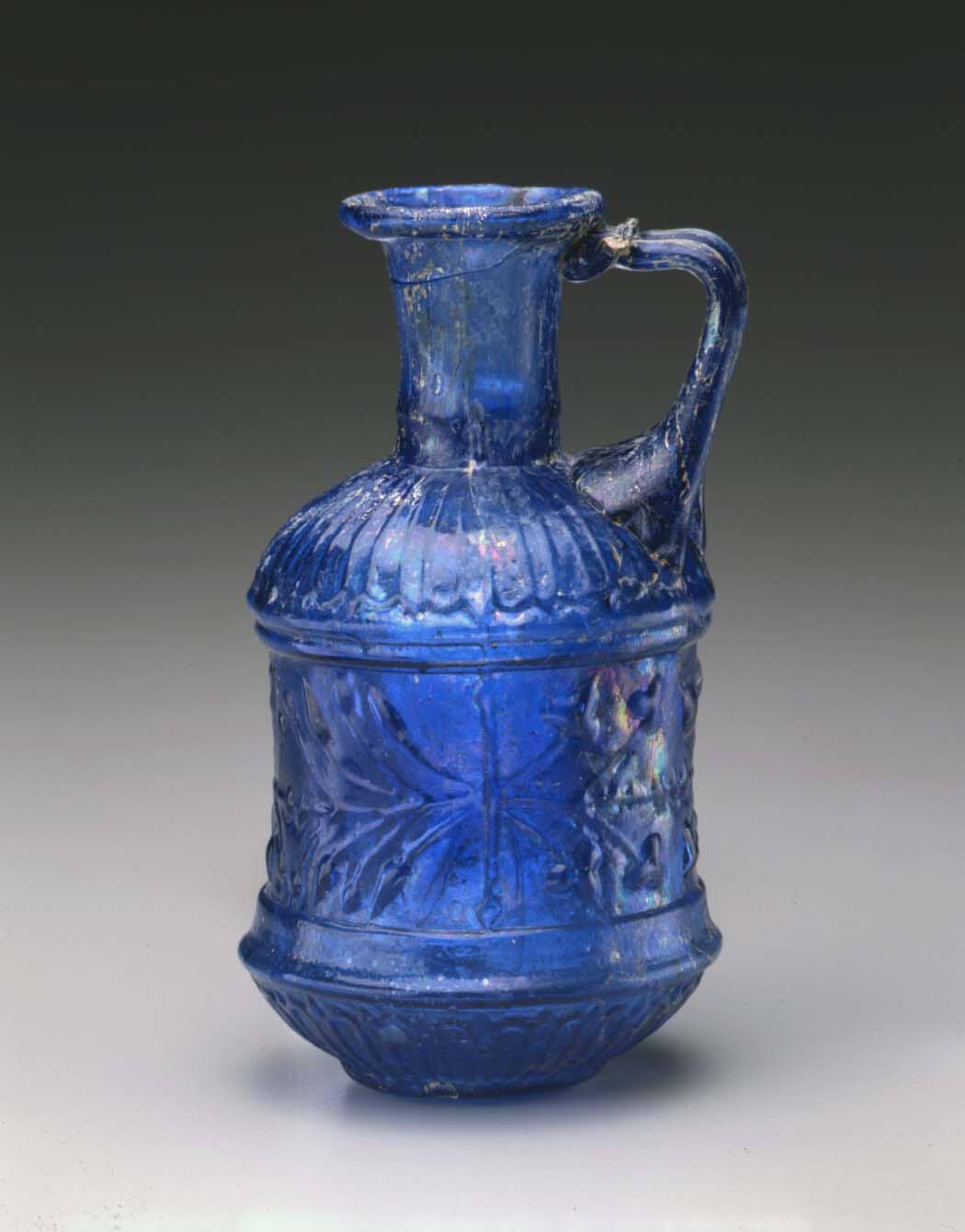 DescriptionThis cylindrical jug, classified as Vessels Type with floral decoration, was made from medium thin, translucent royal blue glass with a brownish green streak at the rim. The fabric cannot be determined due to weathering. A very large elongated bubble is visible in the neck. The neck was free blown, while the body and lower neck were formed in a four-part mold consisting of three vertical sections joined to a cup-shaped base section (MCT I). The tip of the handle is drawn out thin.