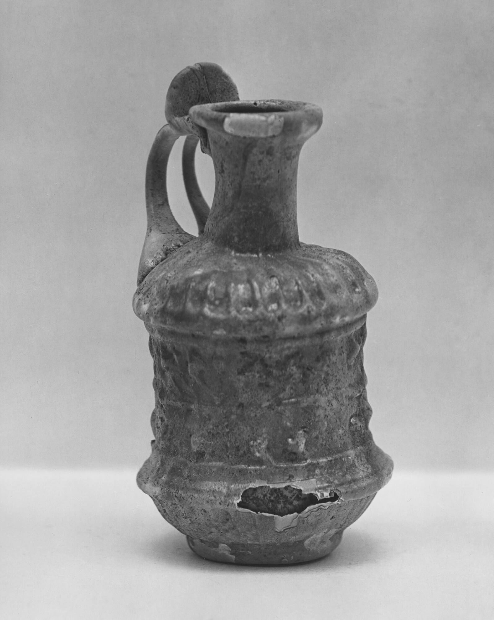 The bifurcated handle, positioned over the seam between mold sections 1 and 2, was applied to the shoulder and attached to the rim with a projecting thumbrest. It has two attachment points on the shoulder and splits toward the thumbrest. The tip of the handle was drawn out thin.