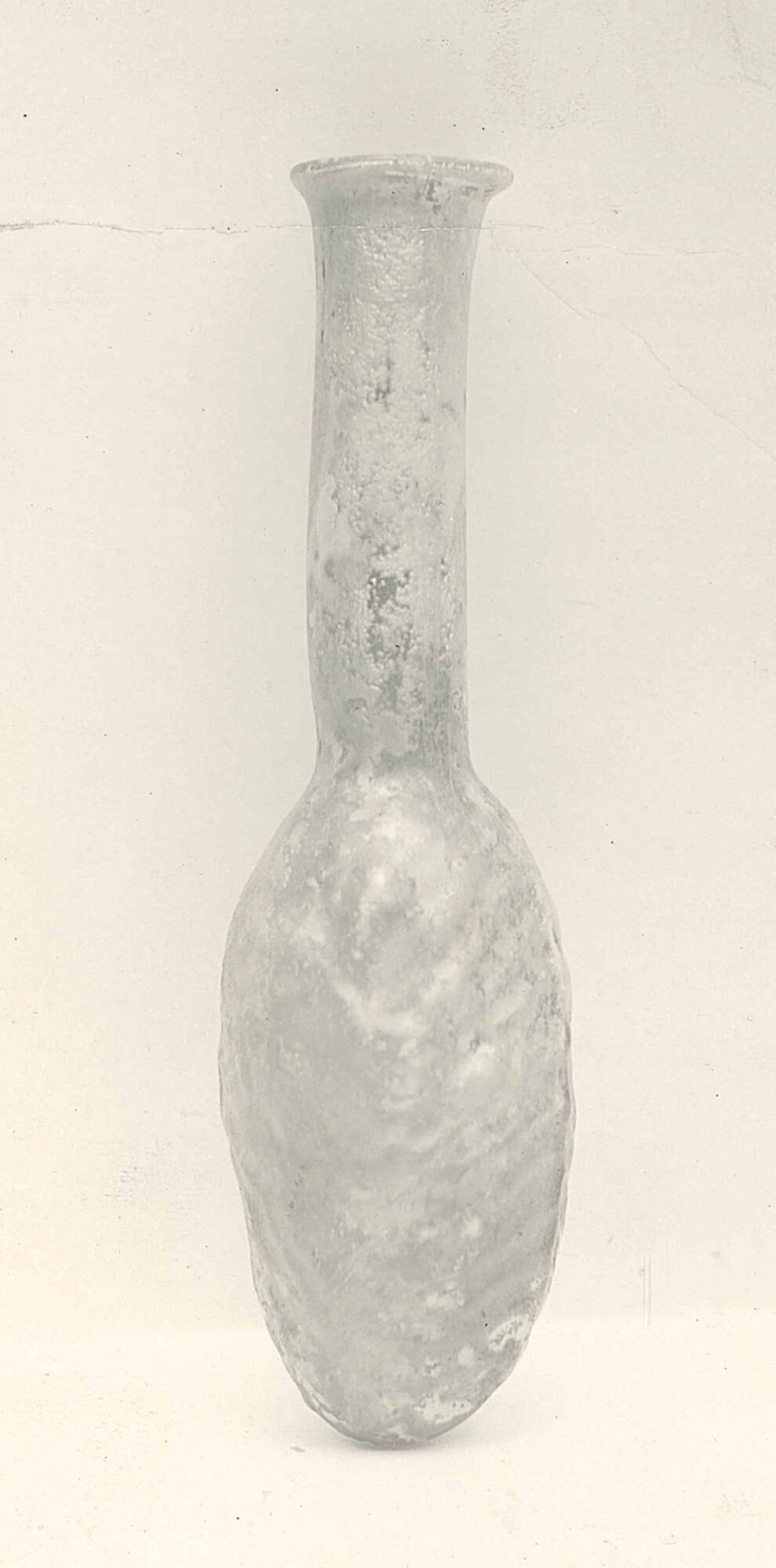 DescriptionThis bottle, shaped like a date, has a tall neck and textured surface that mimics the wrinkles of dried fruit. It was made by blowing glass into a two-part mold and adding the neck and rim by hand. The decorative pattern also includes ridges in a herringbone design along the seams.