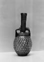 DescriptionThis ovoid bottle with stylized grape pattern, classified as a Stylized Grape Bottle, Series A, is made of translucent grayish yellow green to dusky yellow green glass (near 5 GY 7/2 to 5 GY 5/2) with medium thick walls and pinprick to large vertically elongated bubbles in the neck; the neck and projecting roll are free-blown while the body and collar above the shoulder were blown into a three-part mold with two vertical sections and a disk-shaped base section (MCT VII), producing crisp relief and vertical mold seams that align between the stylized leaves, with a rim rounded and thickened in flame showing a tool mark on the interior, a tall cylindrical neck with a constriction at its base, a hollow projecting roll above the shoulder collar, an ovoid body with a slightly concave base, and two coil handles attached to the shoulder and lower neck over the leaf motifs, with excess glass drawn thin and folded back.