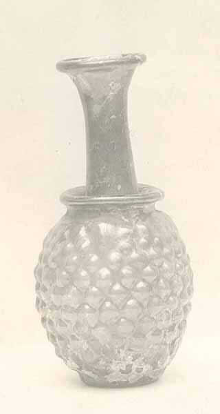 DescriptionThis vessel is made of medium thick glass that ranges in color from translucent to transparent dark grayish green (10 Y 6/6) to light olive brown (5 Y 5/6). Small vertically elongated oval and linear bubbles appear in the neck, with small spherical bubbles in the body. The neck and projecting roll were free blown, while the body and collar above the shoulder were blown into a three-part mold consisting of two vertical sections joined to a disk-shaped base section (MCT VII). The vertical mold seams run halfway between the leaves, and the relief remains crisp. A pontil mark measuring approximately 1.1 cm in diameter is visible on the base. The bottle has a flaring rim folded outward, upward, inward, and downward, a tall cylindrical neck, and a hollow projecting roll above the shoulder collar. Its ovoid body tapers to a flat base. The body is decorated with a stylized grape pattern made up of ten interlocking rows of twenty-one contiguous hemispherical knobs. At the shoulder, opposite each other and centered between the mold seams, are two small vestigial leaves without a central vein. The underside of the base is undecorated. This form is classified as a Stylized Grape Bottle, Series A.