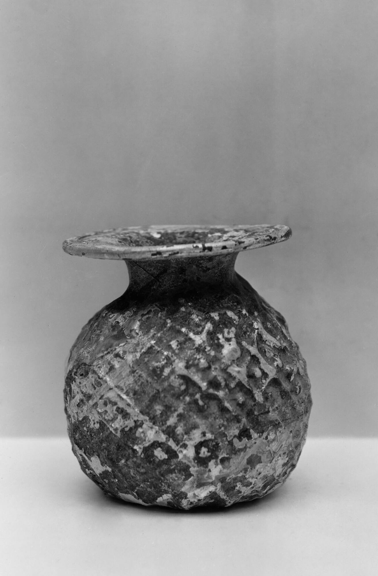 DescriptionThis thin glass bulbous bottle has a low globular body, a very short cylindrical neck, and a wide horizontal mouth rim. The rim is folded outward, upward, inward, and flattened. The neck and mouth were free-blown, while the body was blown into a two-part vertical mold with carefully aligned seams that run around the body and underside of the base. The surface is decorated with an all-over pattern of intersecting diagonal lines forming lozenges, each with a central dot. Thirteen rows of lozenges are visible, with nine columns on one side and eight on the other. The glass is transparent natural green, but the exact color is obscured by weathering. The vessel shows incrustation and iridescence. There is no pontil mark.