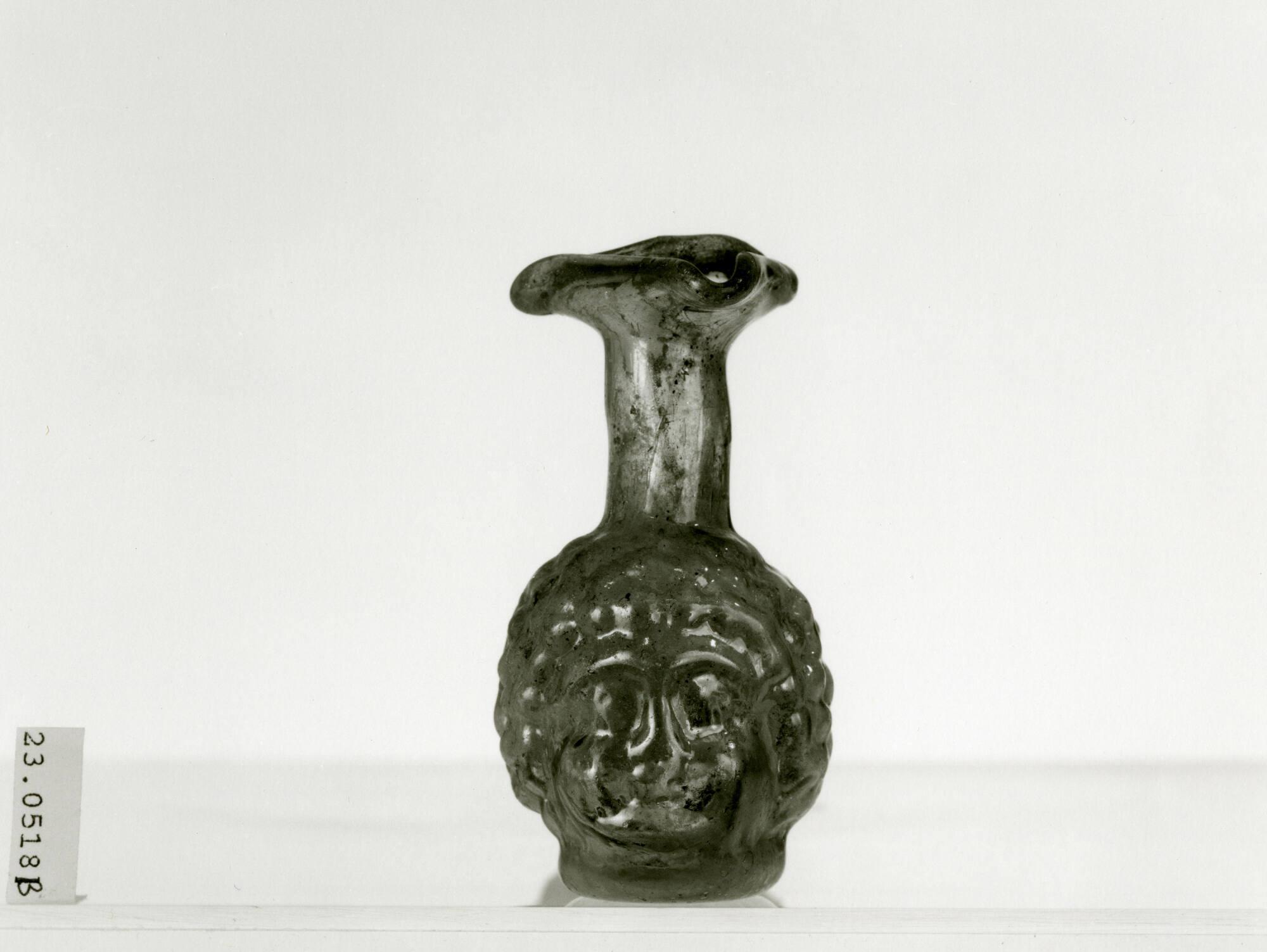 DescriptionThis Roman glass flask is shaped like two youthful heads joined back to back. The faces are rounded and childlike, with small features and patterned rows of hair. It was made by blowing molten glass into a two-part mold, with the mouth and neck shaped separately. The flask’s pale olive color and molded details reflect the style and glassmaking techniques used in the Eastern Mediterranean during the third century.