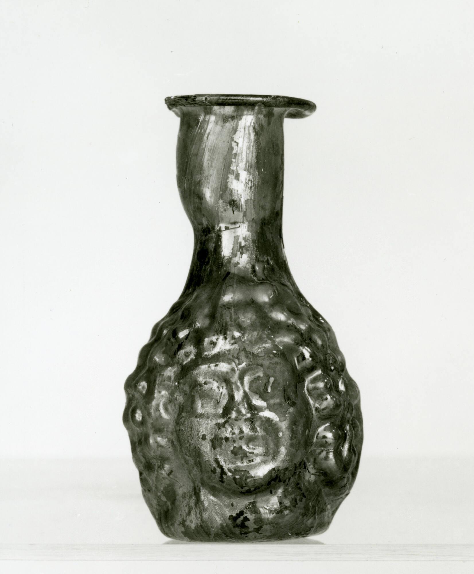 DescriptionThis flask, classified as glass, is made from medium thin material in transparent natural yellow-green glass; the exact color and fabric cannot be determined due to weathering. The rim and upper neck were free blown, while the lower neck and body were blown into a two-part mold of vertical sections, likely open at the base (MCT IX). Mold seams are concealed in the hair at the junction of the two heads; no seam appears on the underside of the base. Relief is moderately crisp, and there is no pontil mark.