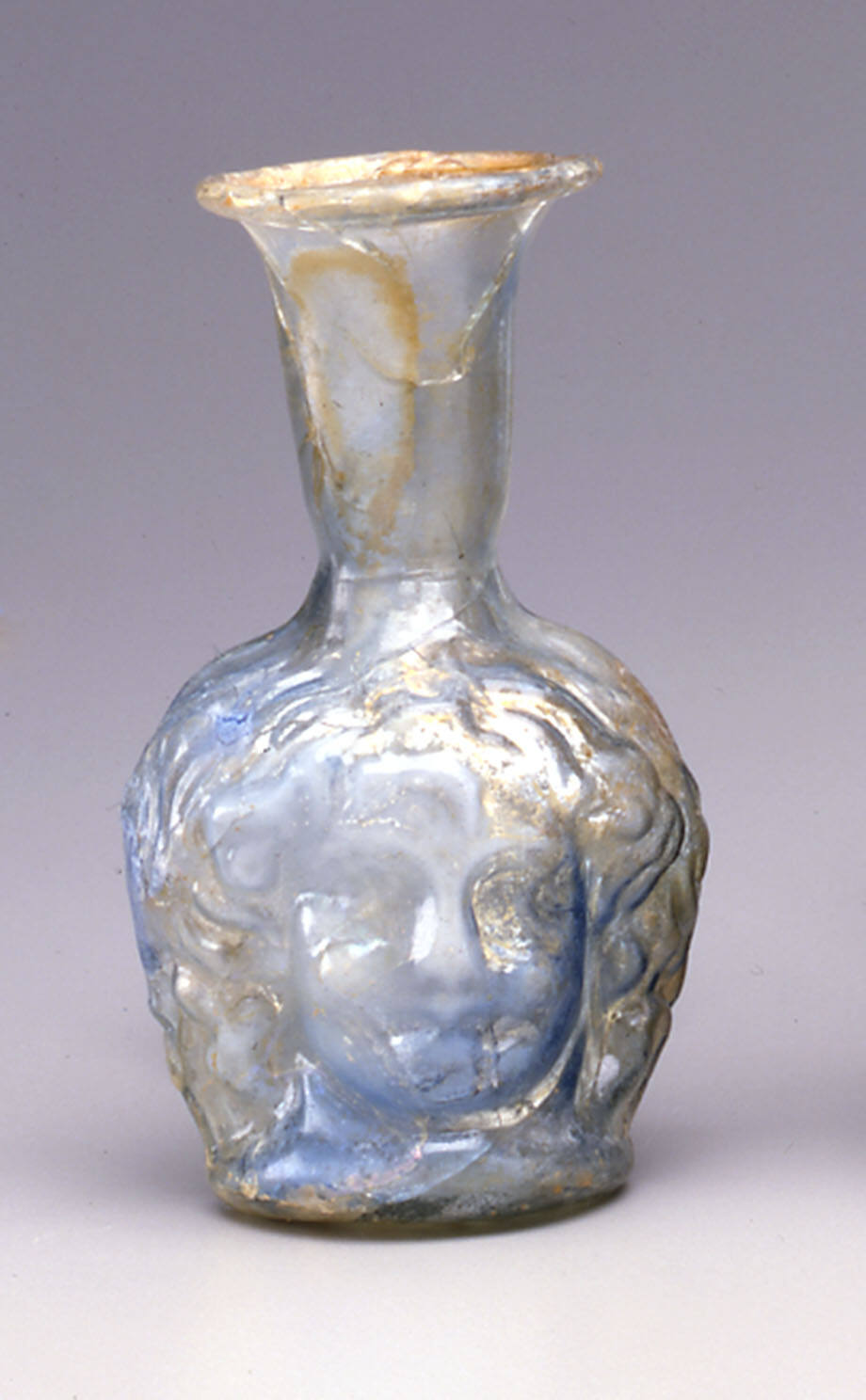 DescriptionThis late Roman glass flask features two faces of Medusa, placed back to back. The faces have wavy hair, wide eyes, and rolls under the chin that once represented snakes. It was made in a mold with the neck and rim shaped by hand.