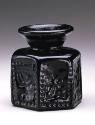 DescriptionThis hexagonal pilgrim jar is made of transparent to translucent dark brownish-orange glass. The true fabric cannot be determined because of its dark color. The neck and mouth were free-blown, while the body was blown into a mold with designs in low relief on the interior. The mold seams cannot be detected, and the relief remains crisp. A ring pontil mark about 1.5 cm in diameter is visible on the base.