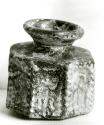 DescriptionThis octagonal jar is made of medium-thick, translucent dark yellowish-brown glass. Its fabric cannot be fully determined because of weathering, but blowing spirals are visible throughout. The neck and funnel-shaped mouth were free blown, with the hollow rim folded outward, upward, inward, and downward to the narrowest point of the opening. The shoulder is horizontal and leads into an eight-sided body that was blown into a mold with designs in low relief on the interior. Although mold seams cannot be detected, the relief remains moderately distinct. A pontil mark about 1.8 cm in diameter is visible on the flat base, which is undecorated.