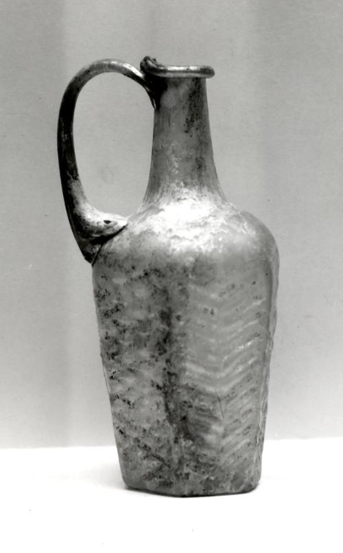 DescriptionThis hexagonal jug is made of thin glass that appears transparent natural pale green (10 G 6/2) with a translucent similarly colored coil and handle. The glass contains blowing spirals, medium-sized vertically elongated bubbles in the neck, and black specks in the handle. The mouth and neck were free blown, while the body was probably blown into a multipart mold with a base plate. The mold relief is crisp. The pontil mark is approximately 1.4 cm in diameter, and the excess glass at the tip of the handle continues into the rim coil.