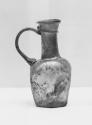 DescriptionThis hexagonal jug is made of thin, transparent to translucent dark royal blue glass with a similarly colored handle and neck coil. A few small spherical bubbles are visible in the glass. The rim and neck were free-blown, while the body was probably blown into a multipart mold, possibly without a base plate. The relief decoration is moderately indistinct, perhaps because the vessel was slightly expanded after it was removed from the mold. A solid coil handle was applied to the shoulder above panel two and attached to the upper part of the neck. A coil of glass continues around the upper part of the neck from left to right, extending from the point where the handle attaches. The rim is folded outward, upward, and inward, forming a circular mouth above the tubular neck and slightly sloped shoulder, which has a concavity on one side. The hexagonal body tapers slightly downward to a concave base. The underside of the base is undecorated but shows many small irregularities that may have been produced when the vessel was expanded against a slightly rough surface. A ring pontil mark approximately 0.7 cm in diameter is visible on the base. On the body, six panels display designs in sunken relief: panel one shows two lozenges with a circle in each; panel two shows a lattice pattern; panel three shows dots; panel four repeats the design of panel one; panel five repeats the lattice pattern; and panel six shows a stylized palm branch with six leaves on each side.