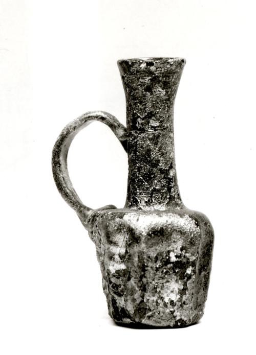 DescriptionThis octagonal jug is made of thin, transparent natural green glass, although its exact color cannot be determined because of weathering. The vessel shows blowing spirals, but the fabric cannot be determined due to its condition. The mouth and neck were free-blown, while the body was probably blown into a multipart mold with a base plate. The relief decoration is indistinct, possibly due to weathering or slight expansion during manufacture. A curved coil handle was applied to the shoulder above a narrow panel and attached to the middle of the neck, where it continues into a neck coil that wraps around the middle of the neck from left to right. The rim is circular with an unworked edge. The neck is tubular, and the horizontal shoulder leads to an octagonal body that tapers downward to a kicked base. The underside of the base shows an indistinct mold-blown design. A ring pontil mark approximately 1.25 cm in diameter is visible on the base. Each of the eight body panels is decorated in sunken relief: the four wide panels contain lozenge patterns, and the four narrow panels display a vertical column of four or five rectangles.