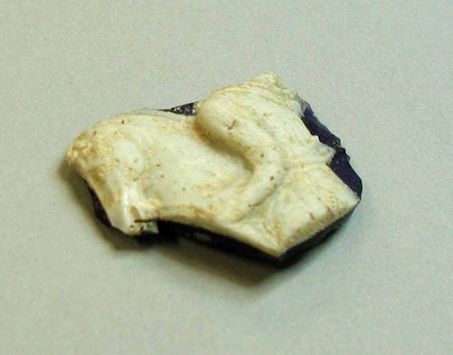 DescriptionThis is a high-relief fragment from a Roman cameo glass vessel, likely a bowl or cup, measuring 3.9 x 2.2 cm. The white relief is unusually thick (0.5 cm) and partly undercut. The preserved scene shows a rider in a sleeved battle tunic and hood astride a galloping horse moving left. The shoulder of the rider projects 0.15 cm over the body of the horse. The modeling is highly plastic and volumetric—cuts are not linear but define form through shifts in plane and thickness. The separation between shoulder and torso is marked by two deep, adjacent incised lines that may have been wheel-cut to define curvature. The surface of the blue glass is marked by regular linear cavities, and the interior shows horizontal polishing lines.