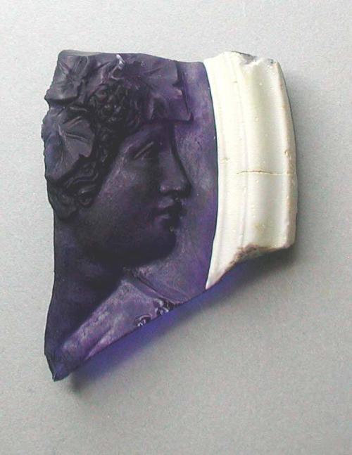 Profile of youth, turned to right, with wreath of vine grapes and leaves. Deep relief cut.