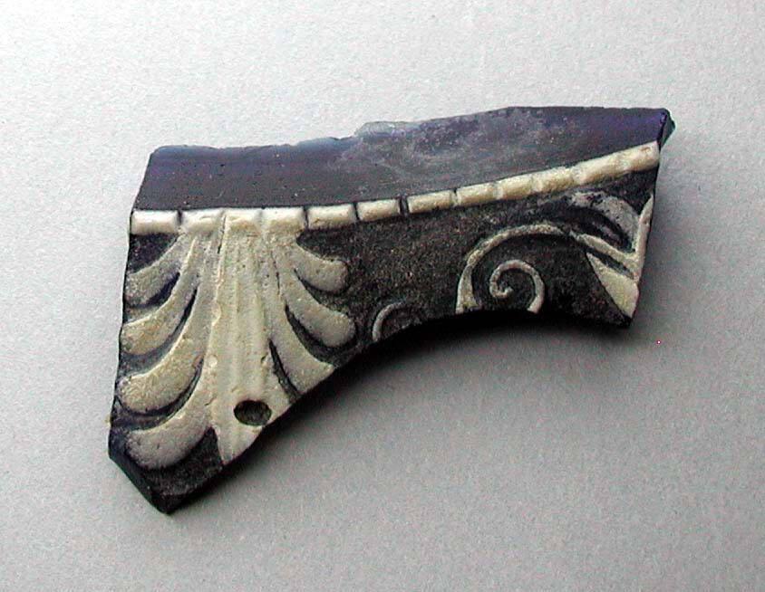 DescriptionOpaque white decoration on translucent blue glass. Flat rim fragment from a shallow dish, featuring a palmette frond and acanthus scroll tendril framed by a dashed white inner border. The relief decoration is achieved through the cameo glass technique, in which a white overlay was selectively removed to reveal the blue ground, creating a high-relief effect.