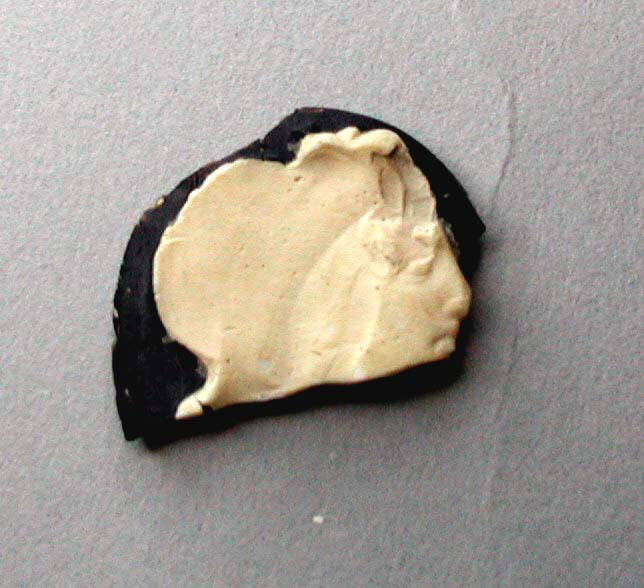 DescriptionThis is a fragment of a cameo glass medallion showing the upper portion of a male head in profile, facing right. The design is carved in opaque white glass against a brown background. The figure has idealized facial features and curly hair escaping from beneath a traveler's cap (petasos), now mostly broken away. The medallion is oval in shape, and only the top half is preserved. The surface is heavily chipped at the front and sides, with weathering visible on the reverse.