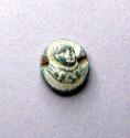 Small, flat disk with molded relief of infant protome, facing right and wearing four prophylactic amulets around its neck, (a cornuto, horn, phallus and round object). Full face, small deeply-set eyes. Hole pierced horizontally through middle for stringing. Back is flat. Done in opaque greenish glass.