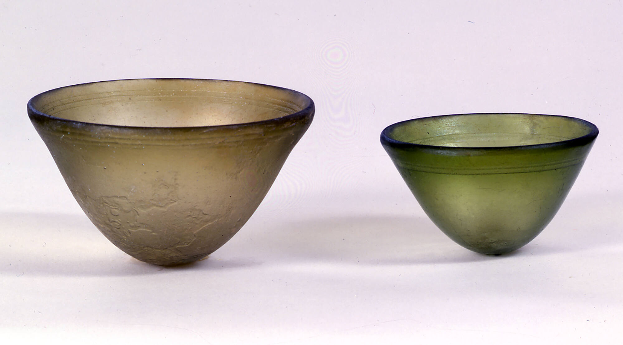 DescriptionThis bowl was made by softening a disk of glass over a mold (a method called sagging) in the mid-2nd to early 1st century BCE. It has a conical shape, with gently sloping sides and a rounded rim. Decorative grooves were carefully cut into the surface, and polishing gives it a smooth finish. The slight greenish-yellow tint reflects natural impurities in the glass.