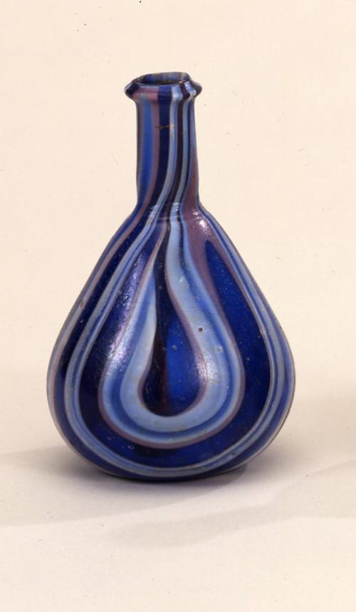 DescriptionBottle with outsplayed rim and a closed, cut-out tubular ledge below an upward- and inward-sloping lip. It features a tall, narrow, cylindrical neck, straight-sided piriform body, and a slightly concave base. The vessel is decorated with a striped mosaic pattern formed from vertical lengths of a single cane. Each cane has a dark blue ground encasing opaque white and pale purple. The stripes begin on one side of the rim, descend the body and base (widening as they go), then ascend to the opposite rim.