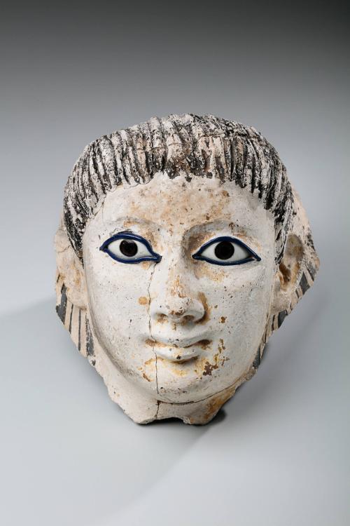 Label TextThe piercing gaze of this mask comes from expertly crafted glass, inlaid to give the deceased the magical ability to see in the afterlife. Opaque white, brown, and black glass form the lifelike eyes, while solid bars of deep blue glass create the dramatic cosmetic eyeliner, a feature of Egyptian art for millennia. These durable, watchful eyes ensured the young man’s senses were restored for eternity. This mask was created for a new kind of burial. Instead of being hidden in sealed tombs, mummies in Roman Egypt were often placed in accessible family mausoleums. This created a need for a permanent, idealized face that could be seen by visitors during commemorative rituals, keeping the deceased forever present in the world of the living.Published ReferencesKunstwerke der Antike, Münzen und Medaillen, Basel, May 13, 1961, lot 228.