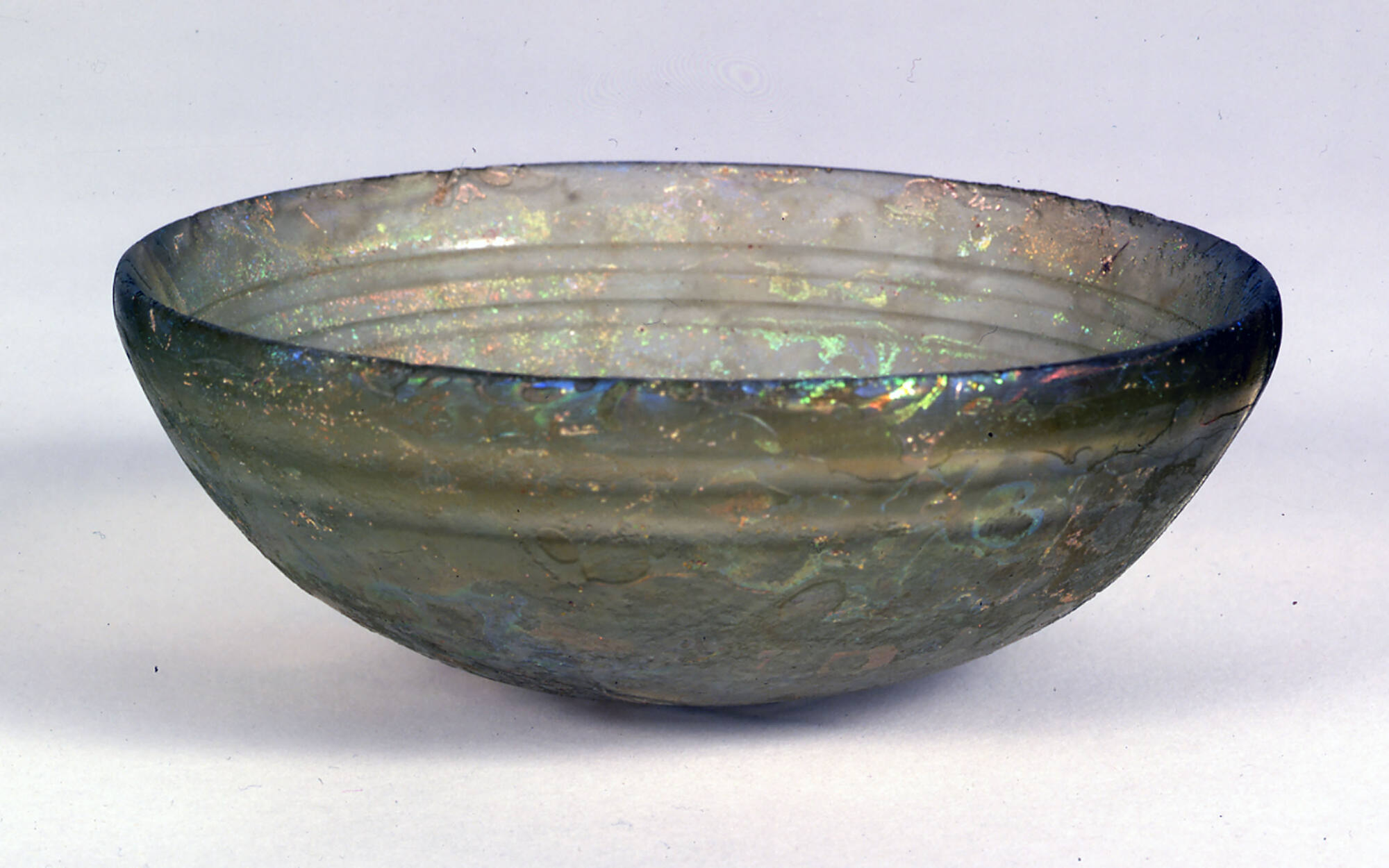 DescriptionThis shallow hemispherical bowl is made of colorless glass with a greenish-yellow tinge. It has an upright, thick rim with an almost pointed edge, a smoothly curving convex side, and a convex bottom. On the interior, two pronounced horizontal grooves are cut in a band below the rim. On the exterior, three narrow horizontal grooves encircle the center of the bottom. The bowl was sagged and then finished with rotary-polishing on the interior, top, and outside of the rim, fire-polished on the rest of the exterior, and cut on both surfaces.